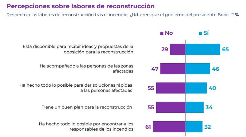 Asimismo, un 65% piensa que el gobierno está disponible a recibir ideas y propuestas de la oposición para las labores de reconstrucción. Pese a ello, solo un 40% cree que se ha hecho todo lo posible para dar soluciones rápidas a las personas afectadas y un 32% cree que ha hecho todo lo posible por encontrar a los responsables de los incendios.