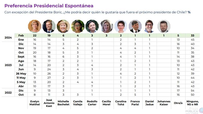 El sondeo de opinión arrojó además que a un 22% de los consultados le gustaría que la alcaldesa de Providencia, Evelyn Matthei, fuese la próxima Presidenta de Chile, imponiéndose por sobre José Antonio Kast y Michelle Bachelet. Además, un 38% considera que es la sucesora del liderazgo de Sebastián Piñera