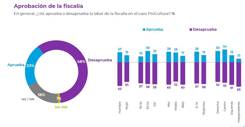 En ese contexto, la encuesta Plaza Pública, que realiza Cadem, dio a conocer que un 58% de los consultados desaprueba la labor del Ministerio Público en ProCultura.