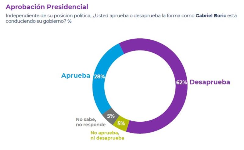 En la primera semana de enero, la aprobación a la gestión del Presidente Boric llegó al 28%, registrando un descenso de dos puntos porcentuales respecto a lo consignado en el sondeo anterior, mientras que su desaprobación alcanzó el 62%.