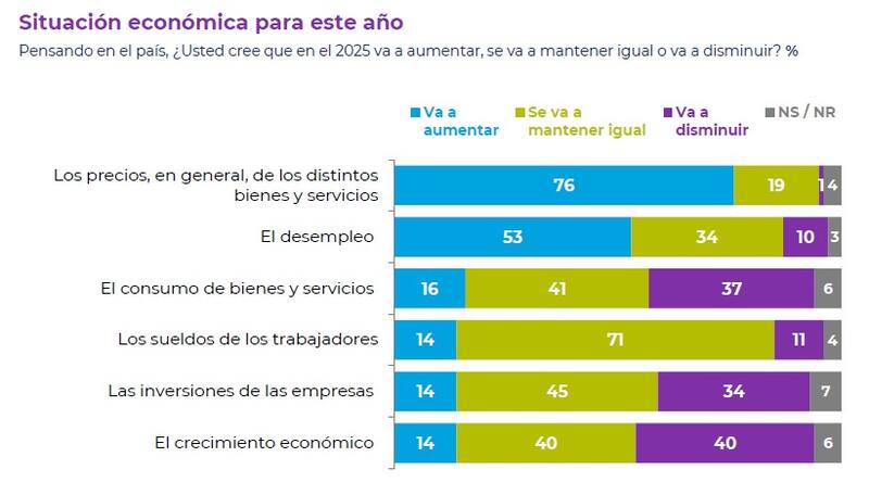 Pensando en el país, un 76% de los consultados cree que en 2025 va a aumentar el costo de la vida, principalmente en los precios en general de los distintos bienes y servicios. Misma situación se evidencia con el desempleo, donde un 53% opina que va a registrar un alza, y un 71% piensa que los sueldos de los trabajadores se mantendrán sin variación.