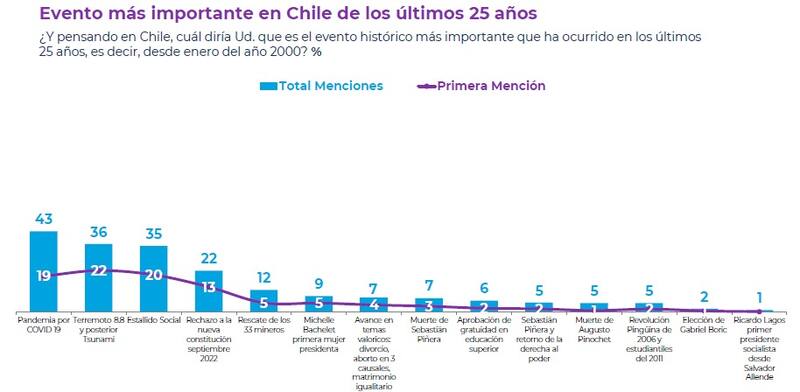 En Chile, la pandemia también es elegida como el suceso más importante con un 43%. Más atrás están el terremoto y tsunami del 2010 (36%), el estallido social (35%), el rechazo a la nueva constitución septiembre 2022 (22%) y el rescate de los 33 mineros (12%).