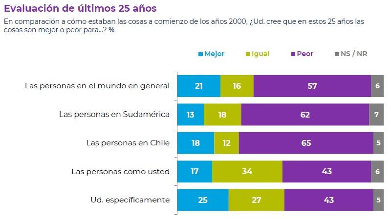 En este contexto, un 65% cree que Chile está peor en comparación a comienzos del año 2000, mientras que para un 62% la situación está peor en Sudamérica.