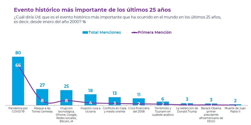 Asimismo, la pandemia por Covid-19 es considerada el evento histórico más importante de los últimos 25 años en el mundo (80%), seguido de lejos por al ataque a las Torres Gemelas (27%), la irrupción tecnológica (25%) y la invasión rusa a Ucrania (18%).