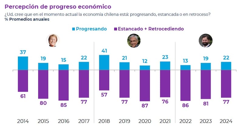 En torno a la percepción del progreso económico en el país, un 77% considera que el año 2024 la economía chilena se mantuvo estancada o en retroceso, cifra que ha ido descendiendo en los tres años de gobierno del Presidente Gabriel Boric. En 2022, evidenció un 86% mientras que en 2023 registró un 81%.