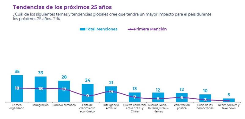 Sumado a ello, el crimen organizado (35%), la inmigración (33%), el cambio climático (28%), la falta de crecimiento económico (24%) y la inteligencia artificial (21%) son los temas y tendencias globales que tendrán un mayor impacto para el país durante el siguiente cuarto de siglo.