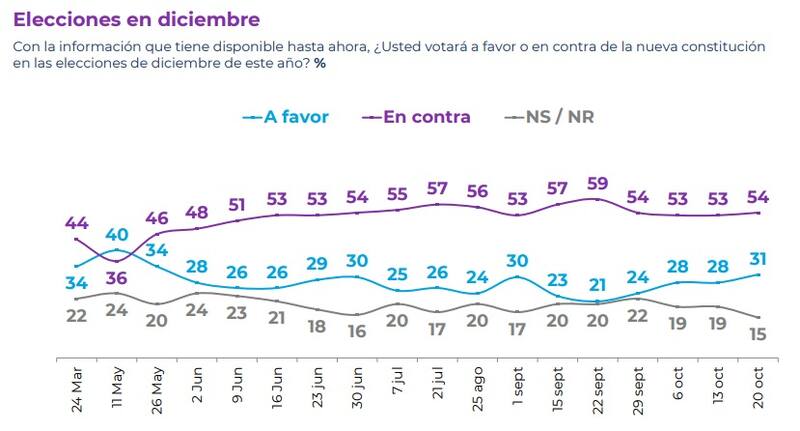 Este domingo se conocieron los resultados de la encuesta Plaza Pública, que realiza Cadem, correspondiente a la tercera semana de octubre, los cuales arrojaron que la opción “En contra” de la nueva Constitución se mantiene como mayoría, alcanzando un 54% de las preferencias.