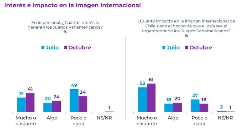 Finalmente, sobre los Juegos Panamericanos que se están disputando en Santiago, hubo un incremento de diez puntos en los últimos tres meses entre quienes tienen mucho interés en el evento (41%) y además de un alza de ocho puntos entre quienes consideran que el hecho de ser sede tiene bastante impacto en la imagen internacional de Chile (61%).