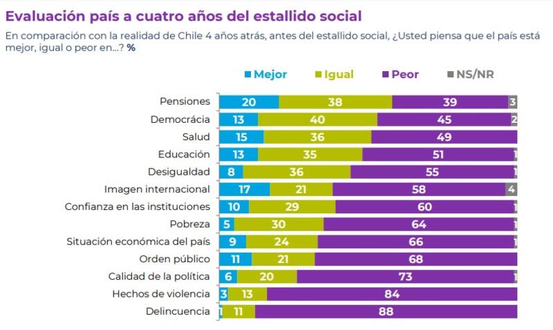 En otro punto, y en el marco de la conmemoración del cuarto aniversario del estallido social, un 88% cree que el país actualmente está peor en delincuencia, un 84% en hechos de violencia, un 73% en calidad de la política, 68% en orden público, 66% en situación económica, 64% en pobreza y 60% en confianza de instituciones.