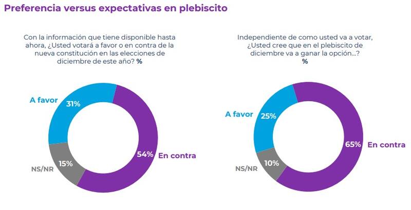 Pese a lo anterior, las expectativas para el plebiscito –recogidas por el sondeo de opinión- dan cuenta de que un 65% piensa que ganará el rechazo a la propuesta constitucional, contra un 25% que cree que vencerá la alternativa “A favor”.