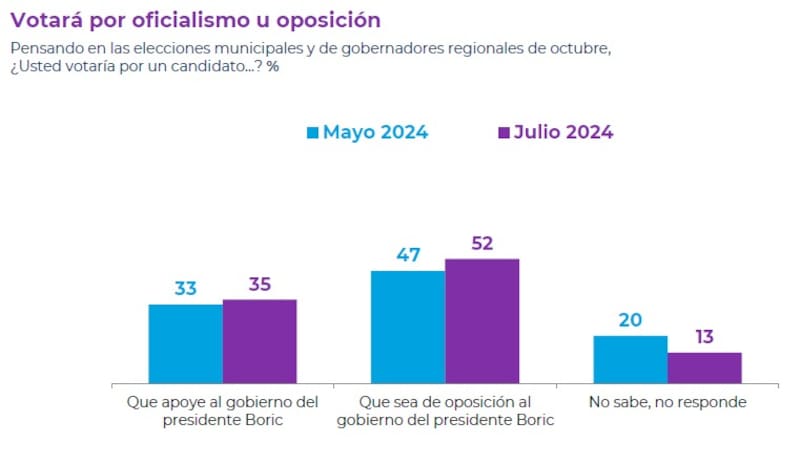 Respecto a las elecciones de octubre, el sondeo de opinión arrojó que un 52% sufragaría por un candidato opositor al gobierno del Presidente Gabriel Boric y un 35% votaría por uno que lo apoye. Asimismo, un 80% está de acuerdo con terminar con la ley seca en los días de los comicios.