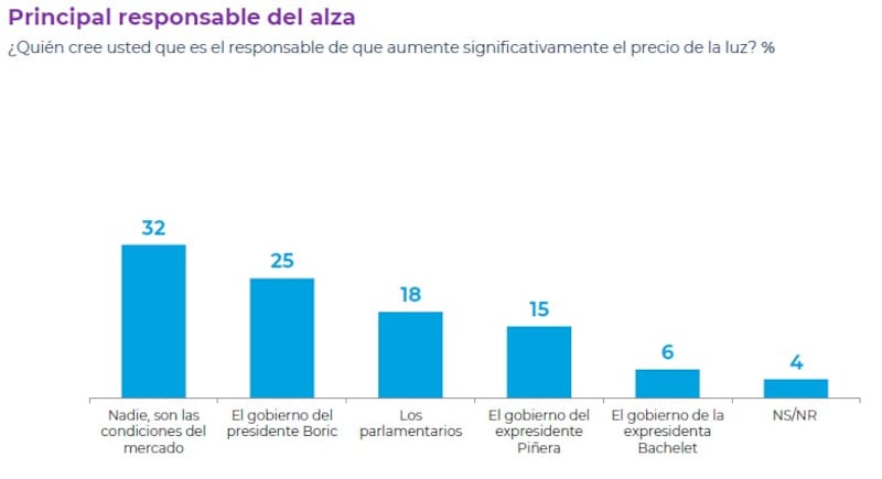 En torno al principal responsable de esta significativa alza en el precio de la luz, un 32% cree que son las condiciones del mercado, un 25% apunta contra el gobierno del Presidente Gabriel Boric, mientras que un 18% atribuye responsabilidad a los parlamentarios y un 15% al otrora gobierno de Sebastián Piñera.