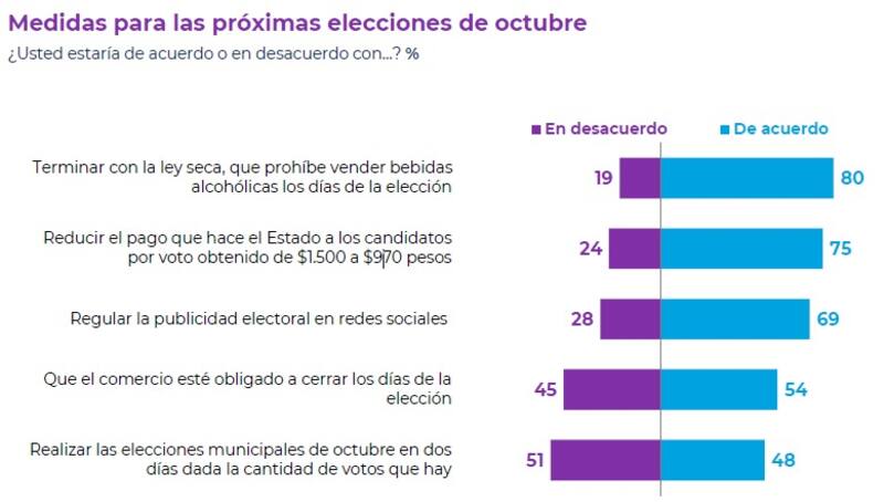 Finalmente, un 80% está de acuerdo con terminar con la ley seca y un 75% se mostró a favor de reducir el pago que hace el Estado a los candidatos por voto obtenido de $1.500 a $970.