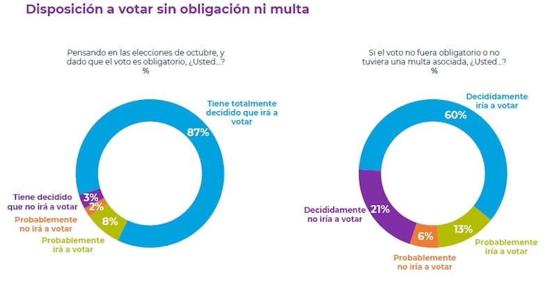 En este contexto, la encuesta dio a conocer que un 87% de los consultados declara que tiene totalmente decidido ir a votar en los referidos comicios, pero si el voto fuera voluntario, el porcentaje cae al 60%, mientras que -en ese mismo escenario- un 21% decididamente no iría a votar.