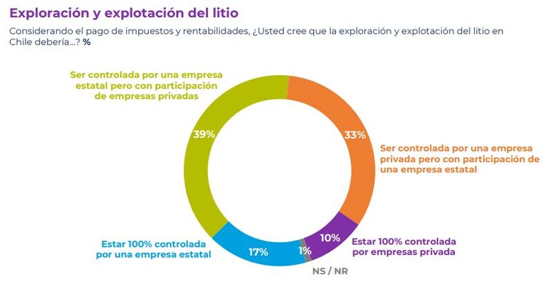 Asimismo, considerando el pago de impuestos y rentabilidades, un 56% se inclina por un control predominante del Estado en esa industria, porcentaje desglosado entre un 39% que prefiere que sea una empresa estatal, pero con participación de empresas privadas y un 17% que opina que sea controlada totalmente por el Estado.