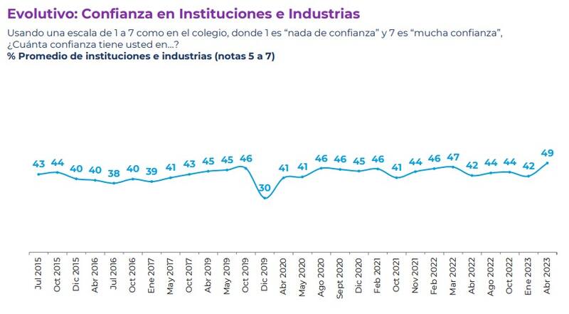 En otros resultados del estudio, se revela un aumento entre los encuestados respecto al nivel de la confianza en las instituciones e industrias, llegando a 49% promedio, lo que se traduce en un alza de siete puntos porcentuales más que lo evidenciado en el pasado mes de enero, siendo Metro (73%), las universidades (70%) y las mineras (66%) las tres mejor evaluadas.