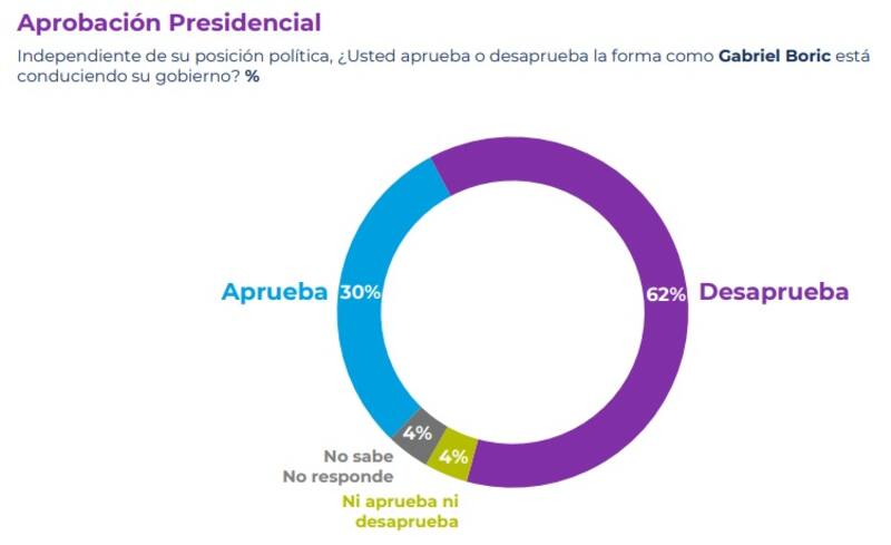 Finalmente, el apoyo a la gestión del Presidente Gabriel Boric se mantiene sin cambios respecto a los últimos sondeos, donde un 30% lo aprueba y 62% lo desaprueba.