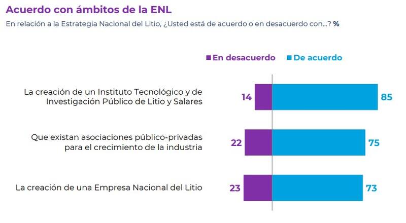 En el mismo contexto, un 85% está de acuerdo con la creación de un Instituto Tecnológico y de Investigación Público de Litio y Salares; y un 73% respalda la creación de una Empresa Nacional del Litio.