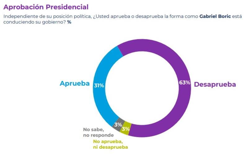 Por otra parte, el sondeo de opinión arrojó que la aprobación a la gestión del Presidente Gabriel Boric registró un incremento de cuatro puntos respecto a la semana pasada, del 27% al 31%, mientras que su desaprobación bajó del 66% al 63%.