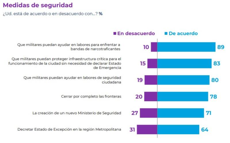 Asimismo, el sondeo de opinión arrojó que un 83% respalda que los uniformados puedan proteger infraestructura crítica sin necesidad de declarar Estado de Emergencia, y un 80% está a favor de que puedan ayudar en labores de seguridad ciudadana.