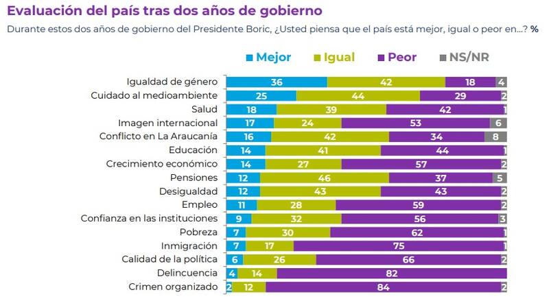 En tanto, en pensiones (46%), cuidado al medioambiente (44%), desigualdad (43%) e igualdad de género predomina la percepción de que el país está igual.