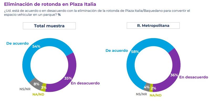 Al respecto, un 54% de todos los consultados se manifestó de acuerdo con la eliminación de la emblemática rotonda para convertir el espacio vehicular en un parque. Mientras que un 58% de quienes residen en la Región Metropolitana apoyan la medida.