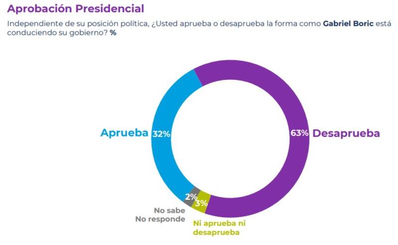 Por otra parte, la aprobación a la gestión del Presidente Gabriel Boric evidencia una mínima alza de 31% a 32%, mientras que su desaprobación se mantiene en 63%.