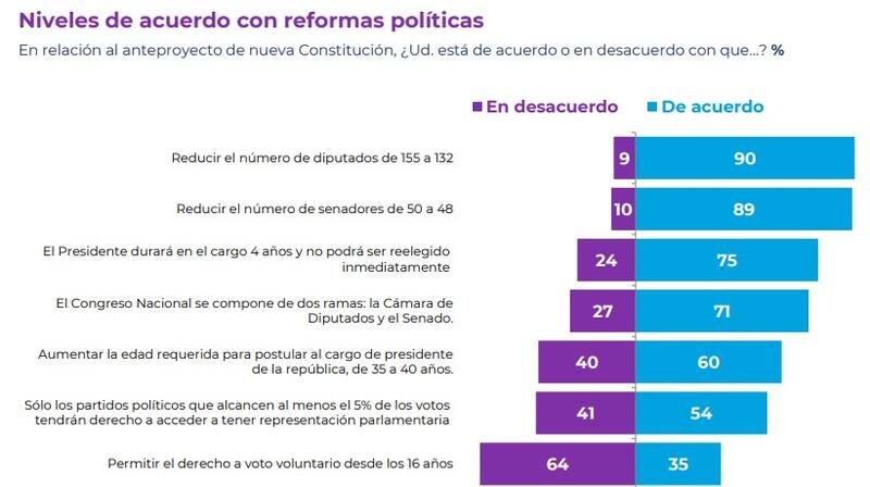 En el mismo contexto, y en relación con las reformas políticas contenidas en el anteproyecto de nueva Constitución, un 75% se mostró de acuerdo con que el cargo de Presidente se mantenga en cuatro años y que no pueda ser reelegido inmediatamente, mientras que un 64% apoya que desde los 16 años se permita el derecho a voto voluntario.