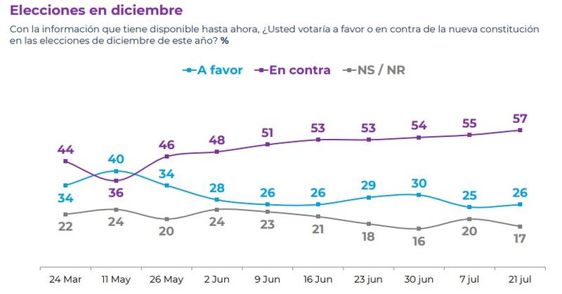 Pese a lo anterior, y en torno al proceso constituyente, se registró un aumento de dos puntos porcentuales, en las últimas dos semanas, entre quienes aseguran que votarán en contra de la nueva Constitución en las próximas elecciones del 17 de diciembre de este año, llegando a un 57% de rechazo. Asimismo, se mantiene en 59% la cantidad de personas que están poco o nada informadas respecto de la propuesta que realizó el Comité de Expertos.