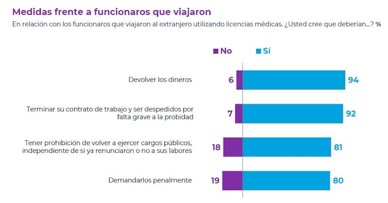 En el mismo tenor, un 94% piensa que estos deberían devolver los dineros; un 81% que se les aplique la prohibición de volver a ejercer cargos públicos, independiente de si ya renunciaron o no a sus labores; mientras que un 80% se inclina por demandarlos penalmente.