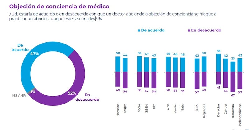 Sumado a ello, un 52% de los encuestados no apoya que un doctor apelando a objeción de conciencia se niegue a practicar un aborto, aunque este sea ley.
