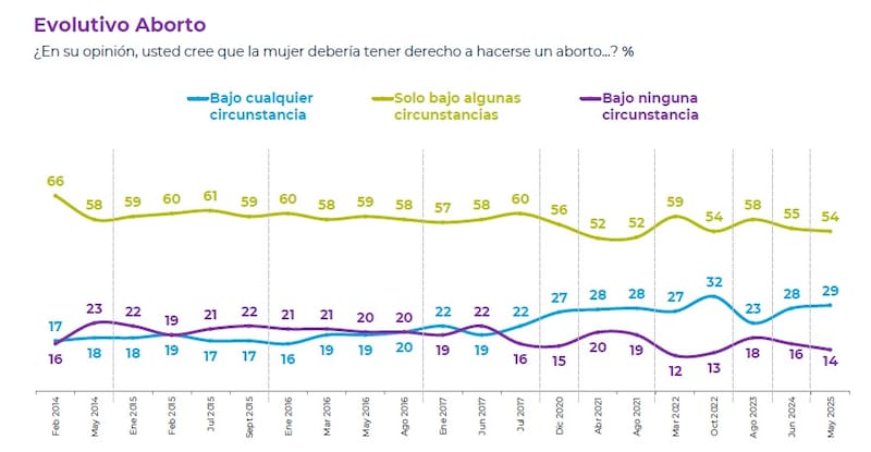 Al respecto, el estudio de opinión detalla que un 54% cree que la mujer debería tener derecho a hacerse un aborto solo bajo algunas circunstancias, un 29% bajo cualquier circunstancia y un 14% bajo ninguna circunstancia.