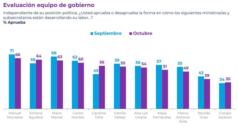 En relación con el gabinete presidencial, solo dos ministras consignan alzas en su aprobación, siendo la más relevante la de la titular del Interior, Carolina Tohá, con un incremento de 11 puntos en comparación con lo registrado en septiembre pasado, subiendo de 45% a 56%. En segundo lugar, se posiciona la jefa de Salud, Ximena Aguilera, con una subida de 5 puntos, alcanzando el 64%. Pese a que el ministro Giorgio Jackson registra un punto porcentual más que la semana pasada, sigue posicionado con la aprobación más baja, con un 35%.