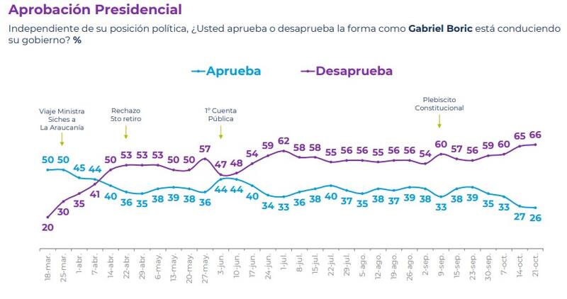 Este domingo se conocieron los resultados que arrojó la encuesta Plaza Pública Cadem, correspondiente a la tercera semana de octubre, la cual dio a conocer que la aprobación a la gestión del Presidente Gabriel Boric nuevamente registró un mínimo descenso de un punto porcentual, llegando al 26%, y acumulando una baja de 13 puntos en el último mes.
