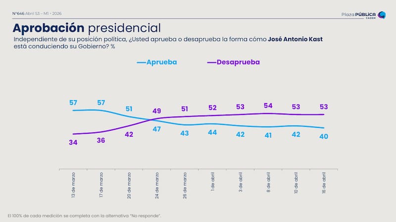 El adelanto de la encuesta Plaza Pública Cadem, dado a conocer este jueves, mostró que la aprobación a la gestión del Presidente José Antonio Kast cayó a 40%, mientras que la desaprobación llegó a 53%.