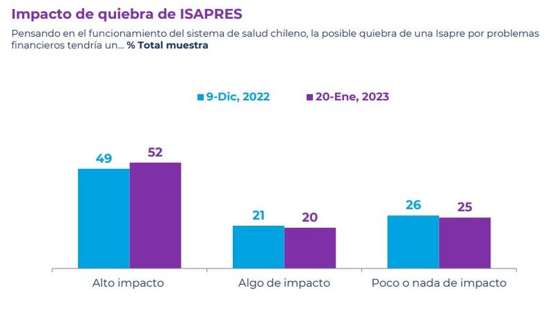 Pensando en el funcionamiento del sistema de salud chileno, un 52% piensa que la posible quiebra de una Isapre por problemas financieros tendría un alto impacto. En la misma línea, el 43% piensa que el principal problema para el sistema de salud si quebrara una Isapre sería el aumento de las listas de espera y atenciones en el sector público.