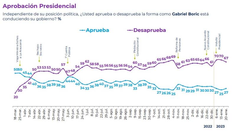 En tanto, el Presidente Gabriel Boric muestra una leve mejoría en su aprobación, subiendo del 25% al 27%, y su desaprobación alcanza el 67%, tres puntos porcentuales menos que lo evidenciado la semana anterior.