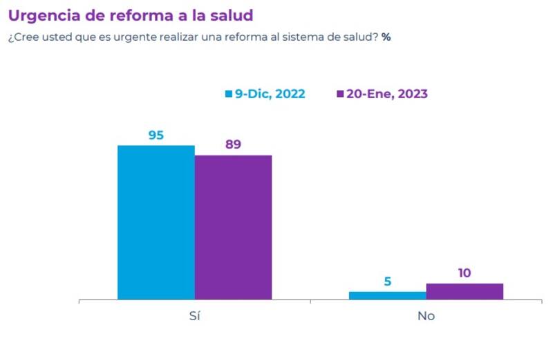 En la tercera semana de enero, un 89% está de acuerdo con que es urgente realizar una reforma al sistema de salud. En torno a las áreas que debiesen ser prioritarias, el 41% cree que se debe aumentar la disponibilidad de médicos especialistas, mientras que el 38% piensa que es necesario reducir las listas de espera. Un 25% se inclinó por mejorar la infraestructura de los consultorios y hospitales públicos y un 22% cree que se tiene que utilizar la red privada para mejorar la calidad y acceso del sector público.