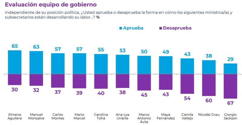 Por el contrario, los representantes del gabinete con mayor aprobación son la titular de Salud, Ximena Aguilera (65%); el subsecretario de Interior, Manuel Monsalve (63%); y los ministros de Vivienda y de Hacienda, Carlos Montes y Mario Marcel respectivamente, ambos con un 57%.