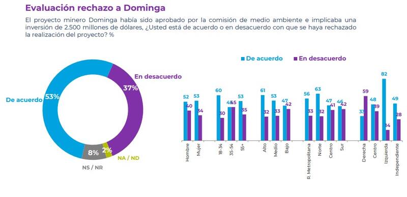 El sondeo semanal también analizó la opinión de los consultados respecto del proyecto minero Dominga, que anteriormente había sido aprobado por la Comisión de Medio Ambiente e implicaba una inversión de 2.500 millones de dólares, sin embargo, el pasado miércoles, el Comité de Ministros del Presidente Boric lo rechazó de manera unánime.