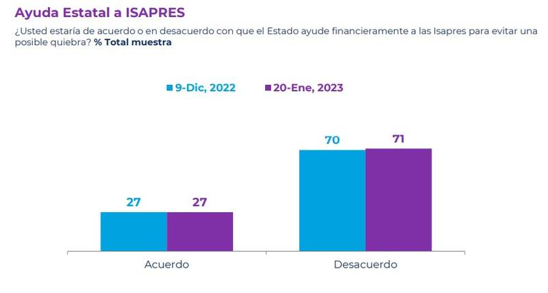 Asimismo, el 71% está en desacuerdo con que el Estado ayude financieramente a las Isapres para evitar una posible quiebra. De generarse este episodio, el 68% de los encuestados buscaría ser aceptado en otra Isapre, mientras que el 32% se iría a Fonasa.