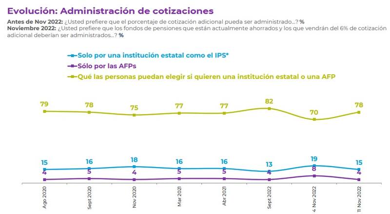 En la misma línea, el 78% de los encuestados quiere poder elegir quién administrará los fondos de pensiones, ya sea una institución estatal o una AFP, un incremento de 8 puntos respecto a lo consignado en el sondeo anterior.