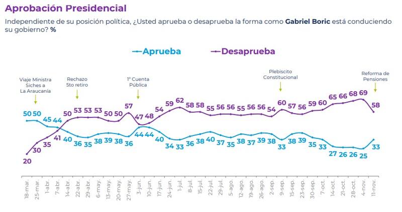 Según se extrae del sondeo de opinión, que corresponde a la segunda semana de noviembre, esta alza en la aprobación del mandatario ocurre luego de evidenciar una caída progresiva de esta tendencia desde mediados de septiembre, y se produce en el contexto de la presentación de la reforma de pensiones, informada a inicios de este mes.