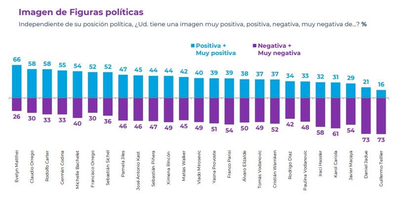 Finalmente, y respecto a la imagen de figuras públicas, la alcaldesa de Providencia, Evelyn Matthei, continúa liderando este ítem con un 66%; seguida del gobernador Claudio Orrego (58%); el alcalde de La Florida, Rodolfo Carter (58%); el jefe comunal de Puente Alto, Germán Codina (55%) y la expresidenta Michelle Bachelet (54%). En el otro extremo se ubican el presidente de la UDI, Javier Macaya (29%); el alcalde de Recoleta, Daniel Jadue (21%) y el timonel del PC, Guillermo Teillier (16%).