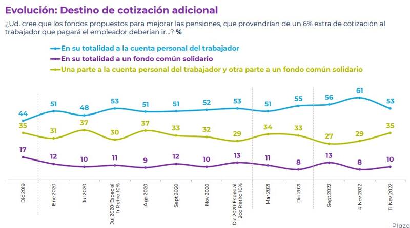 Sobre el destino del 6% de cotización adicional, un 53% cree que debería ir en su totalidad a la cuenta individual, registrando una caída de 8 puntos respecto a la semana anterior, mientras el 35% piensa que una parte debe ir a un fondo común y otra parte a la cuenta del trabajador, opción que aumentó en 6 punto respecto al mismo periodo. En tanto, sólo el 10% optó que en su totalidad deberían ir a un fondo común.