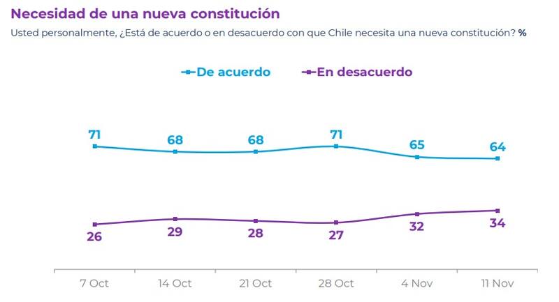 Por otra parte, respecto a la discusión constitucional, el 64% está de acuerdo con que Chile necesita una nueva Constitución.