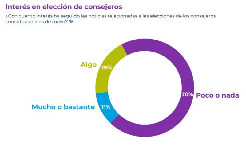 El sondeo reveló además un importante incremento de 28 puntos porcentuales, desde el 10 de febrero pasado, en torno al desinterés por parte de los encuestados con las noticias relacionadas a las elecciones de los consejeros constitucionales del próximo 7 de mayo. Si hace poco más de un mes el desinterés llegaba al 42%, esta semana alcanzó el 70%.
