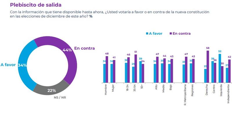 Sin embargo, con la información disponible hasta entonces, un 44% votaría en contra de una nueva Constitución en diciembre de este año, mientras que un 34% lo haría a favor y un 22% aún está indeciso.