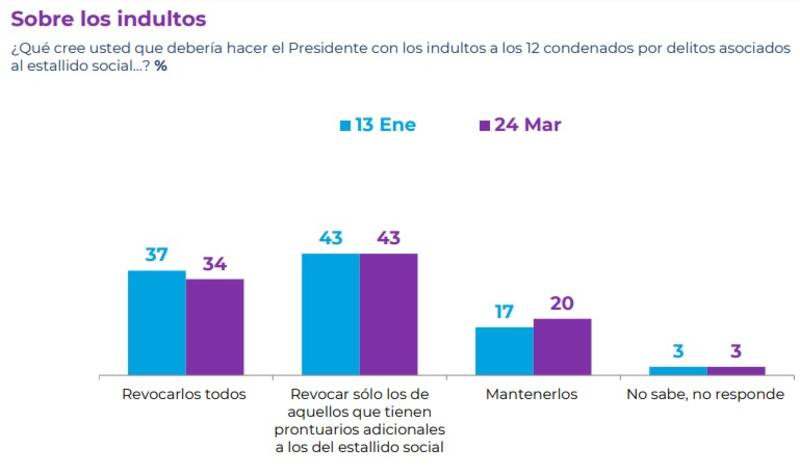 Por otra parte, un 71% de los encuestados se mostró en desacuerdo con la decisión del Mandatario de indultar a los doce condenados por delitos asociados al estallido social.