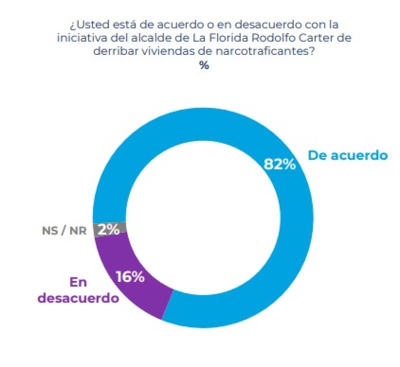 Pese a ello, un 65% está de acuerdo con que Chile necesita una nueva Constitución. Además, el sondeo de opinión arrojó que un 82% de los encuestados apoya la medida del alcalde de La Florida de demoler las casas-narco y, por otra parte, un 71% está en contra de los indultos a condenados por delitos asociados al estallido social.